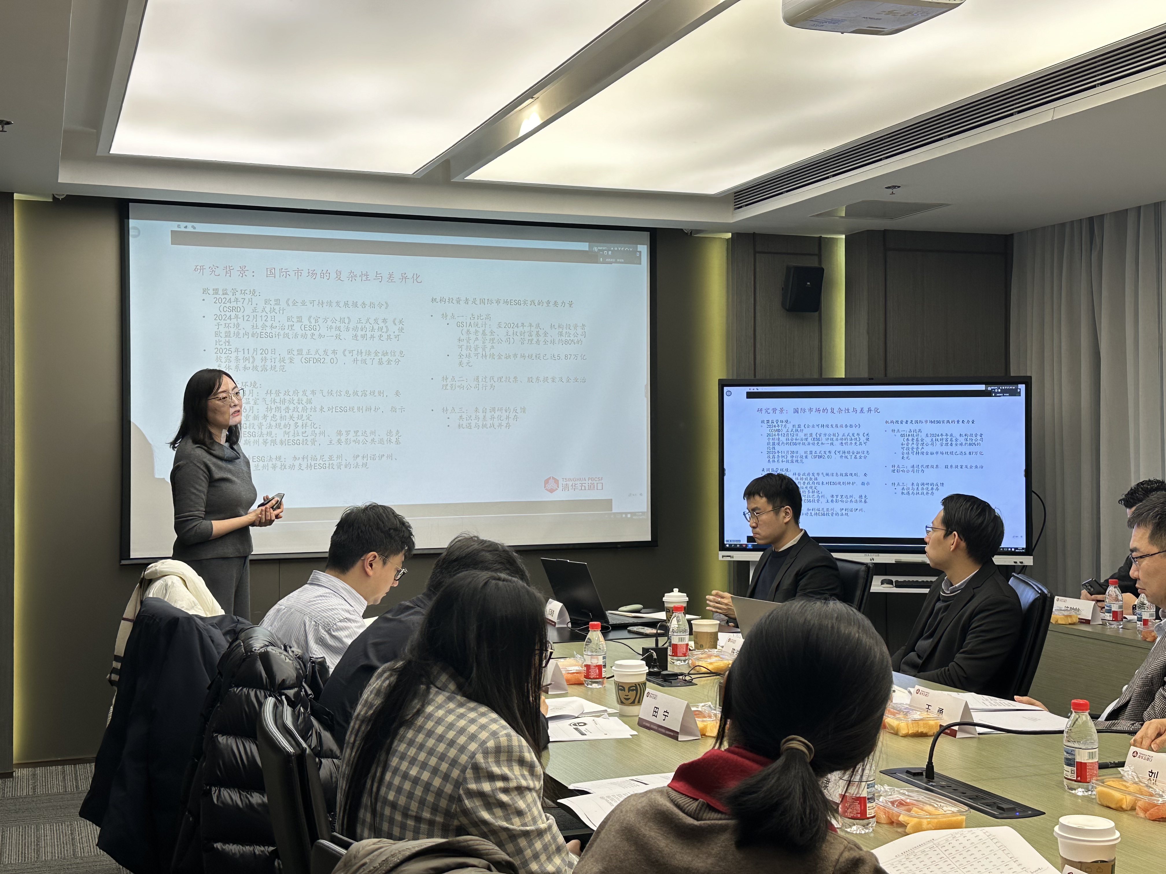 绿色金融研究中心高级研究专员黎菁汇报了《ESG趋势对资产配置策略的影响研究》课题的进展。该研究涵盖了主权基金、养老金、险资以及资产管理公司等43家国际机构和18家国内机构,聚焦筛选、整合、积极所有权、主题投资和影响力投资五大ESG投资策略,系统分析和总结了国际及国内ESG投资的最新趋势与实践。另外,在应对气候变化目标方面,研究整理了机构投资者在气候风险的识别、评估和管理的最新实践。研究建议机构投资者应持续加强能力建设,推动ESG投资从被动合规转变为主动的价值创造决策。