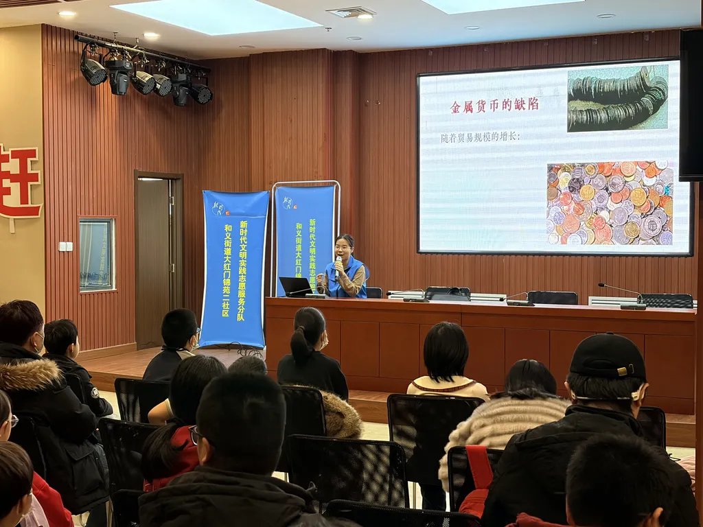 陈琪颖同学以“‘智’在‘币’行——货币形态演变背后的技术革新”为主题,带领孩子们探索货币的发展历程。她从远古的以物易物与实物货币讲起,依次介绍了金属货币、纸币、电子货币、央行数字货币等不同货币形态的演变历程与背后的“技术魔法”。她还通过互动提问引导孩子们观察不同货币的优缺点,启发孩子们思考货币演变与社会需求、技术进步的深层关联,培养孩子们的金融认知与创新思维。