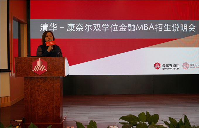 副研究员、金融MBA教育中心副主任许玲博士为到场的学生做了详细的项目介绍。除了着重介绍项目的七大优势之外,许玲特意提到了目前2016级学生正在美国康奈尔大学进行的第二次赴美学习中的实战华尔街模块。在此模块中,2016级学生有幸在位于曼哈顿 Bryant Park的中国银行(纽约分行)大楼里与美国黑石集团联合创始人、全球主席兼首席执行官苏世民先生面对面,共话“成功秘诀”。